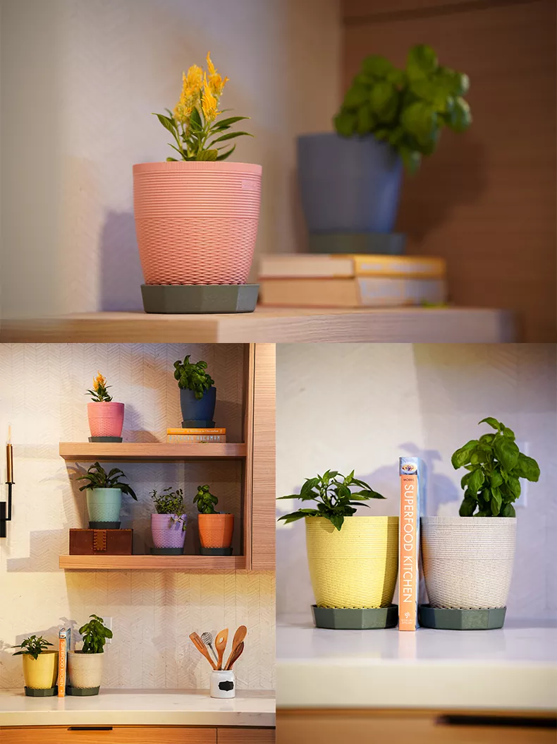 ชุดนี้มีกระถางดอกไม้สามใบที่มีขนาดแตกต่างกัน กระถางขนาด 4 นิ้วมีขนาดเล็กที่สุด กระถางขนาด 5 นิ้วมีขนาดปานกลาง และกระถางขนาด 6 นิ้วมีขนาดใหญ่ที่สุด กระถางแต่ละใบมีฐานรองน้ำ