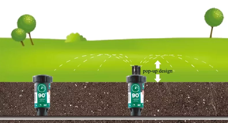 สปริงเกอร์แบบป๊อปอัปจะลอยขึ้นโดยอัตโนมัติเมื่อเชื่อมต่อกับแหล่งจ่ายน้ำ และจะหดกลับพร้อมกับสนามหญ้าเมื่อปิดน้ำ