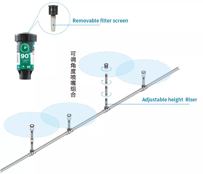 ผลิตภัณฑ์ของเราครอบคลุมสปริงเกอร์สองประเภท: แบบหมุนและแบบคงที่ สปริงเกอร์แบบหมุนและแบบคงที่มีตัวเลือกมุม เช่น 90°, 180° และ 360° เมื่อจับคู่กับสปริงเกอร์แบบมุมที่ปรับแต่งได้ สามารถตอบสนองความต้องการของสถานการณ์การชลประทานที่แตกต่างกันตั้งแต่พื้นที่คงที่ไปจนถึงการปรับเปลี่ยนที่ยืดหยุ่น ตั้งแต่พื้นที่มุมเล็กไปจนถึงพื้นที่ทั้งหมดขนาดใหญ่ โดยไม่จำเป็นต้องซื้ออุปกรณ์เพิ่มเติม