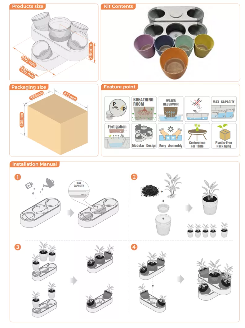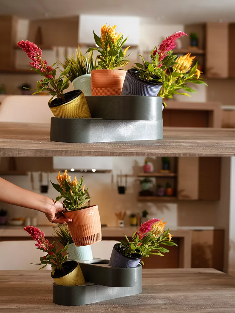 วางฐานกักเก็บน้ำทั้งสองไว้ในลักษณะขวาง แล้ววางกระถางดอกไม้ไว้ด้านใน Watex Stackable Desktop Garden Kit ผลิตจากวัสดุพลาสติกฟางข้าวสาลีคุณภาพสูงและเป็นมิตรกับสิ่งแวดล้อม ไม่เพียงแต่มีสไตล์เท่านั้น แต่ยังทนทานและใช้งานได้ยาวนานอีกด้วย Stackable Desktop Garden ติดตั้งง่ายอย่างไม่น่าเชื่อและเป็นส่วนเสริมที่ดีเยี่ยมให้กับบ้านทุกหลัง