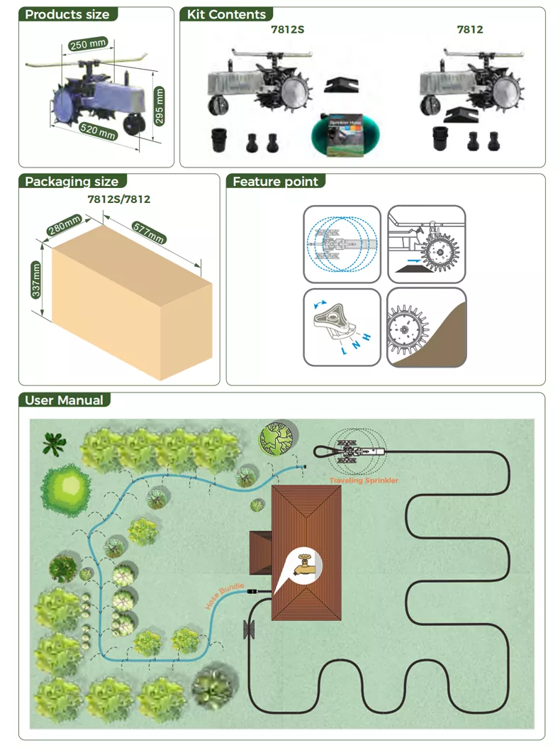 เครื่องพ่นยาชลประทานแบบสปริงเกลอร์สำหรับเดินทาง ซึ่งขับเคลื่อนด้วยแรงดันน้ำประปา ไปตามเส้นทางที่กำหนดโดยสายยางสวนที่คุณมีอยู่สำหรับการรดน้ำ โดยจะหยุดที่ตำแหน่งที่กำหนดไว้ล่วงหน้าโดยอัตโนมัติเมื่อเสร็จสิ้น ทำให้เป็นพันธมิตรในการชลประทานในอุดมคติสำหรับสนามหญ้าที่กว้างขวางหรือแถบสีเขียว ตัวเหล็กหล่อสำหรับงานหนักพร้อมสีเกรดภายนอกทำให้มั่นใจถึงความทนทานและความทนทาน ระบบอัตโนมัติเต็มรูปแบบเพื่อการทำงานแบบแฮนด์ฟรีที่ง่ายดาย สะดวก และเป็นมิตรกับสิ่งแวดล้อม